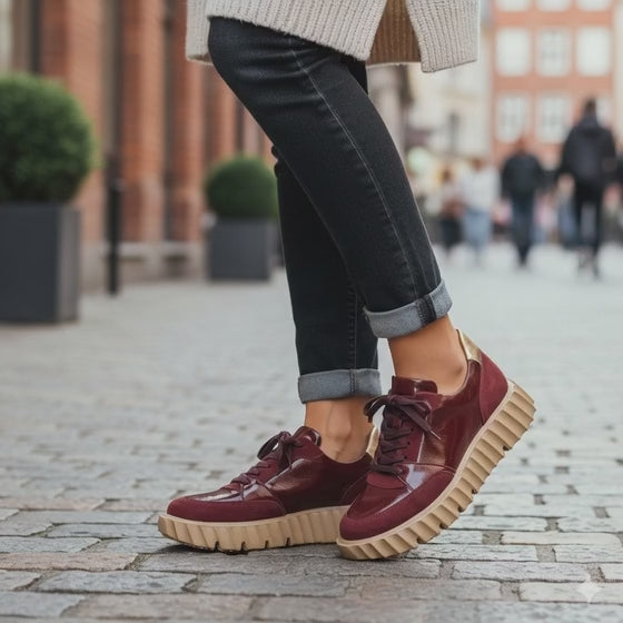 Crafted with a luxurious blend of deep red patent leather and soft suede, these shoes offer a sophisticated twist on casual footwear. The striking gold accent on the heel adds a touch of glamour, making them perfect for both everyday wear and special occasions.