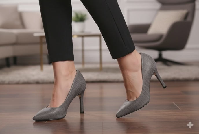 Elevate your everyday with these sophisticated grey pumps. Crafted with a subtle embossed texture, they offer a modern twist on a timeless silhouette. The sleek pointed toe and comfortable heel height make them perfect for the office, a night out, or any occasion where you want to make a polished statement. Experience effortless style and undeniable comfort. Shop now and step into elegance.